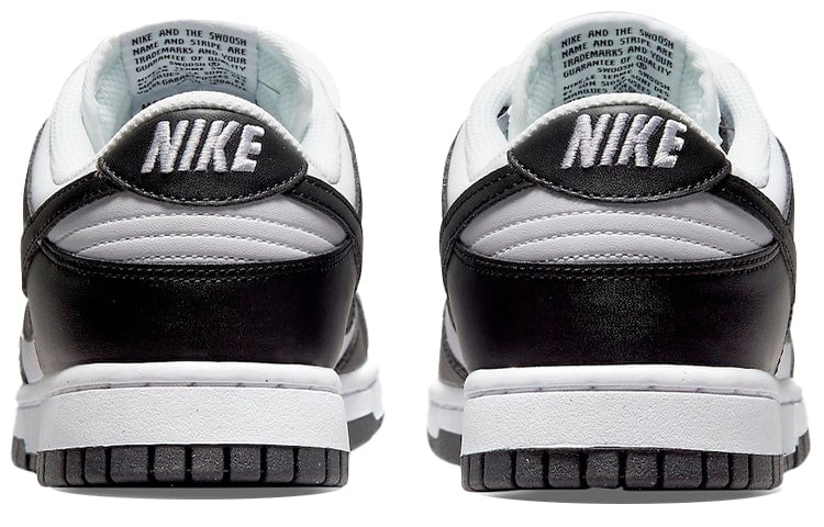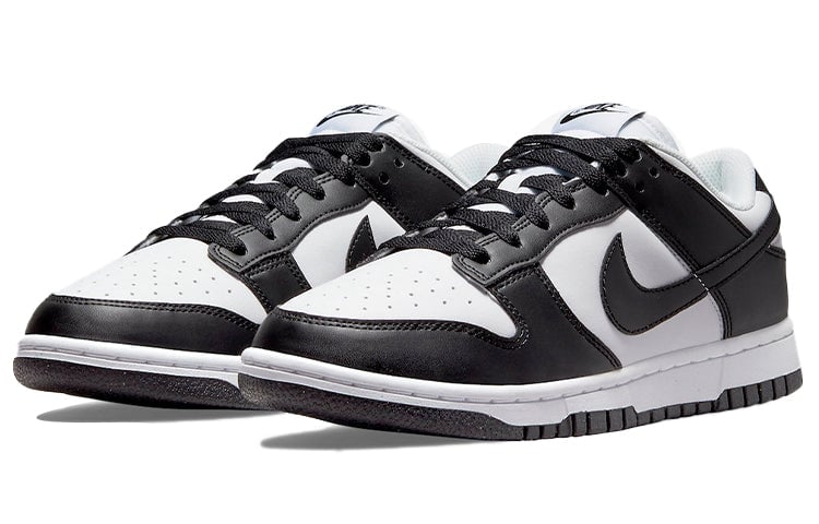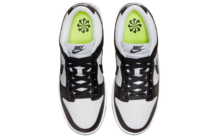 Nike Dunk Low Next Nature “Panda.” A clean design with special features, including a synthetic leather upper complements white base. The sockliner and pinwheel logo are both neon green while the heel tab has standard branding elements, including a woven Nike tongue tag and an embroidered Nike wordmark.